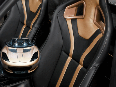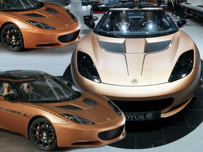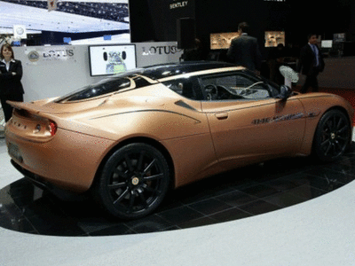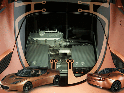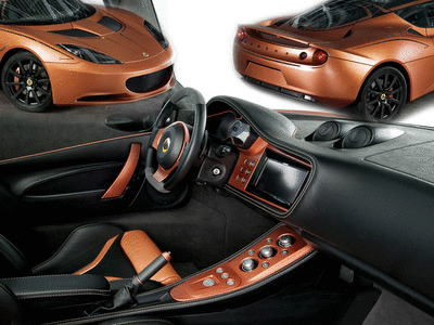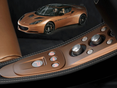 The Evora 414E Hybrid is a concept car that is equipped with a 7-speed transmission and two drive settings, including Eco and Sport. The vehicle is mainly maid in a copper color, which is used not only in the exterior but also interior of the concept, including the instrument panel, seat covers and brake calipers.